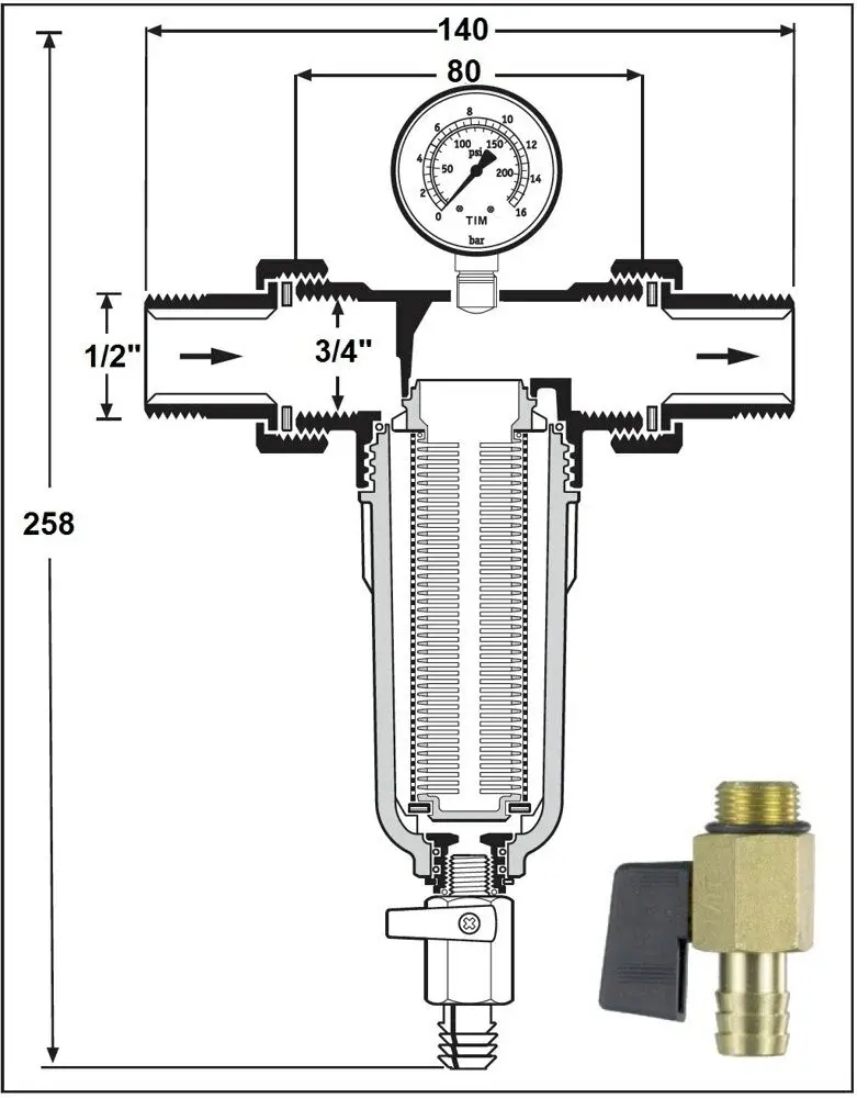 Фильтр оснащён манометром и двумя отводами с наружной резьбой 3/4", что позволяет контролировать давление и регулировать его в системе водоснабжения.