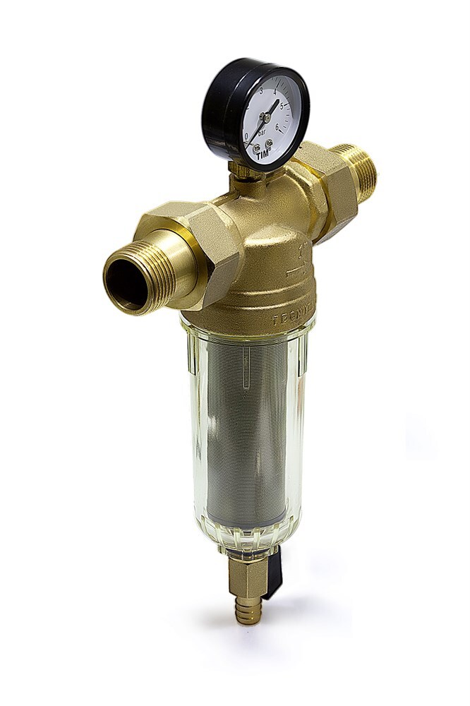 Фильтр подключается горизонтально и имеет манометр для контроля давления в системе.