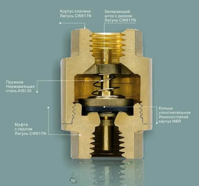 — предназначен для обеспечения движения в одну сторону рабочей среды. Чаще всего транспортируемым носителем является вода, но может пропускать через себя воздух и не агрессивные к материалу жидкости. Механизм функционирования — пружинный.