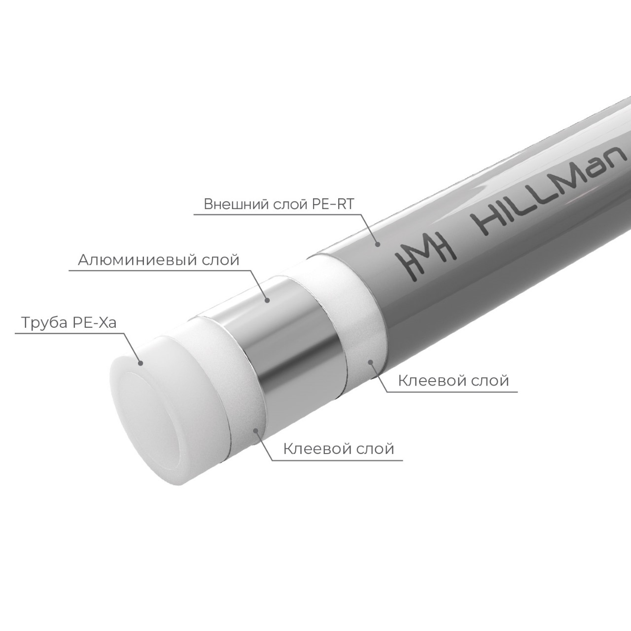 Труба универсальная из сшитого полиэтилена HillMan Stabil – это высококачественный трубопроводный материал, предназначенный для использования в системах отопления, водоснабжения и других инженерных netwoрках. С размерами 16,2 x 2,6 мм, эта труба обеспечивает отличную прочность, гибкость и долговечность, что делает её идеальным решением для различных приложений.